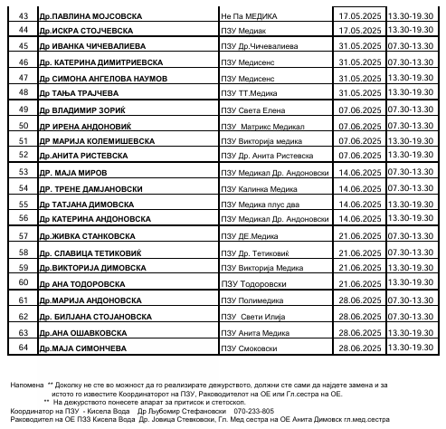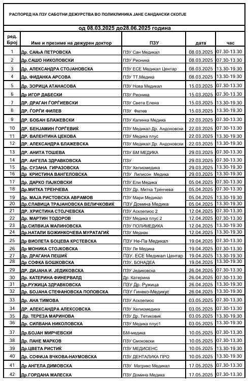 РАСПОРЕД НА ПЗУ САБОТНИ ДЕЖУРСТВА ВО ПОЛИКЛИНИКА ЈАНЕ САНДАНСКИ СКОПЈЕ