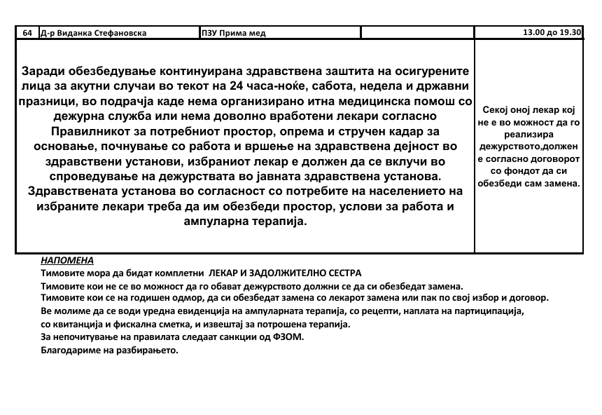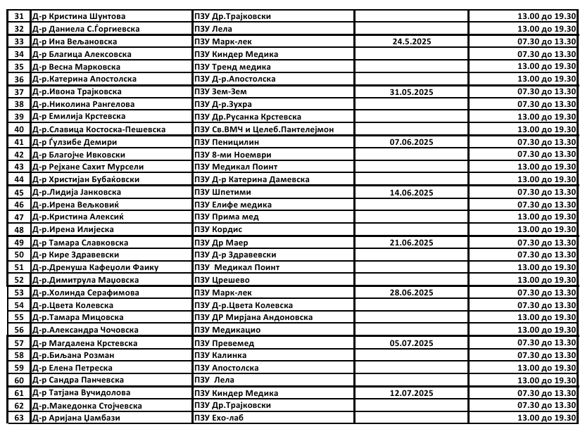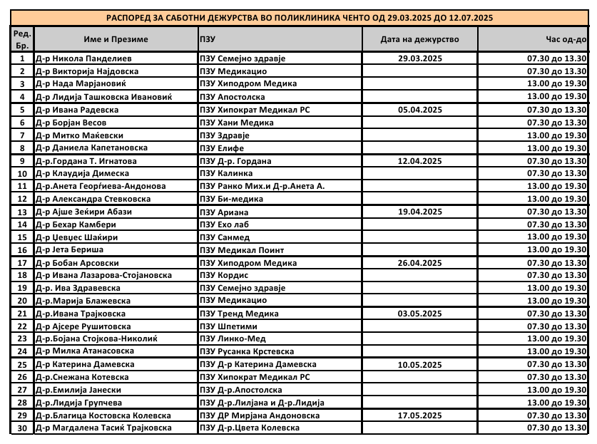 Списокот за дежурства за Поликлиника Ченто за период од 29.03.2025 до 12.07.2025 година.