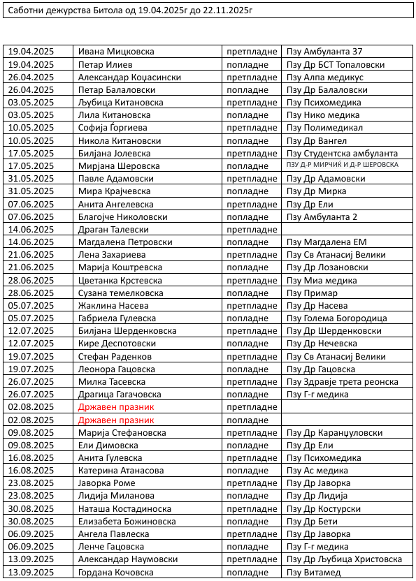 Саботни дежурства Битола од 12.04.2025г до 22.11.2025г