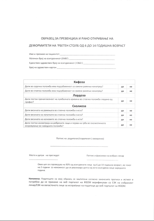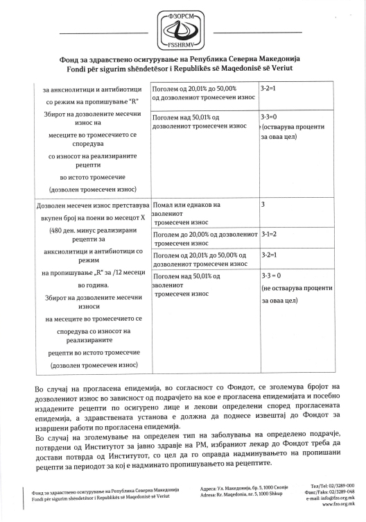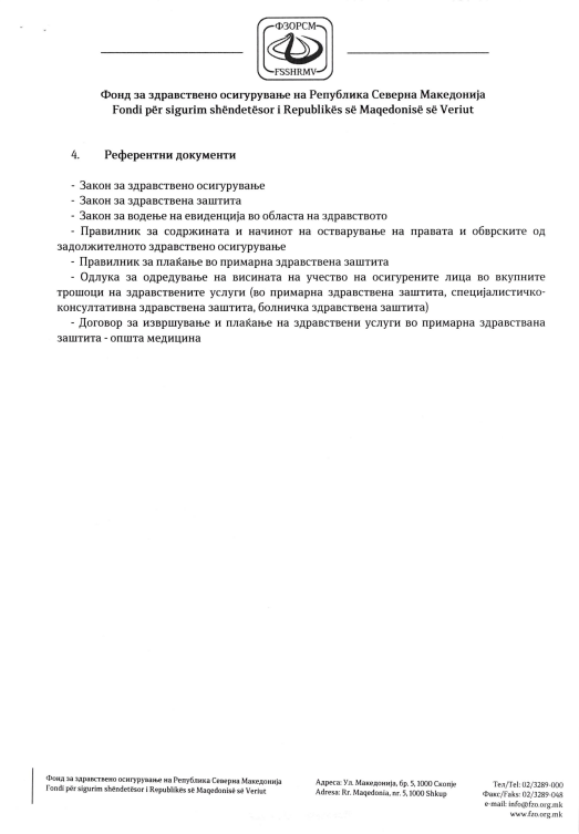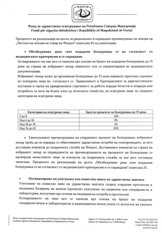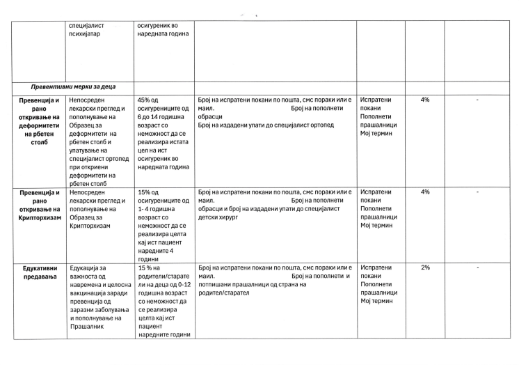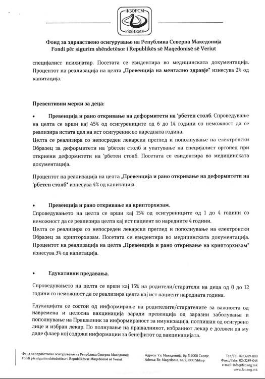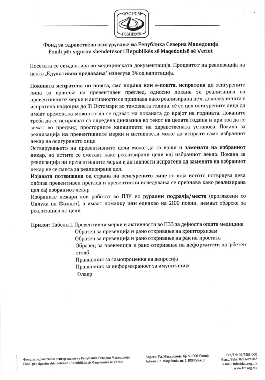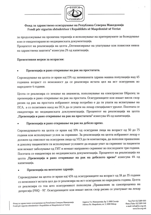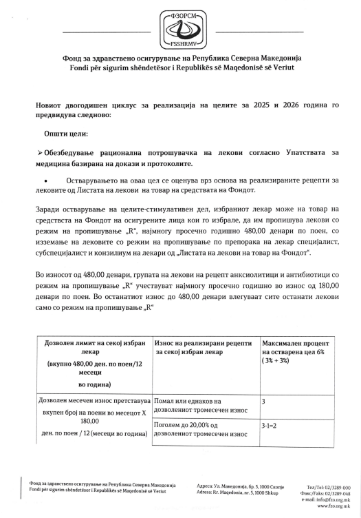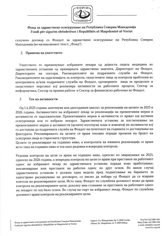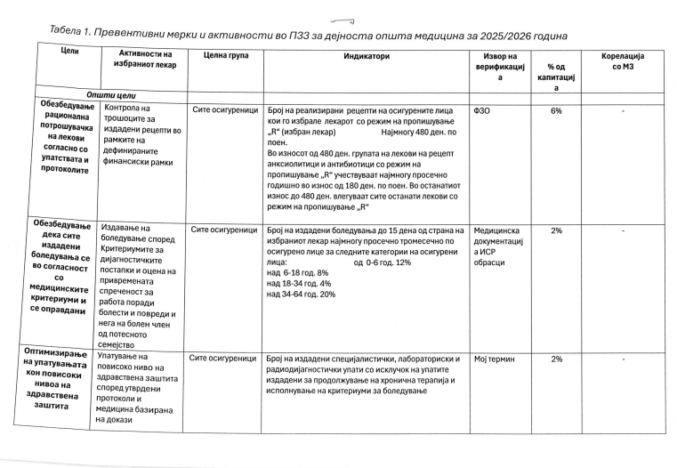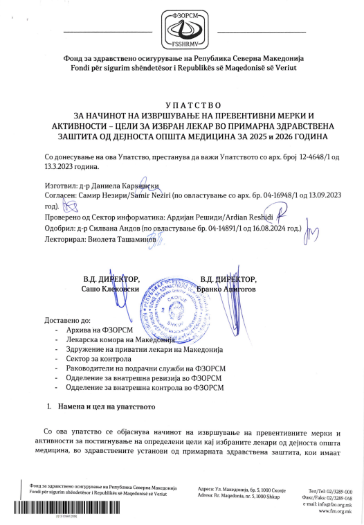 Упатсвото за начинот на извршување на превентивни мерки и активности – цели за избран лекар во примарна здравствена заштита од дејноста општа медицина за 2025 – 2026 година со архивски број 12 – 12156/1 од 23.04.2025 година.