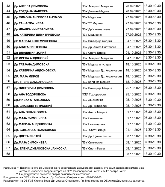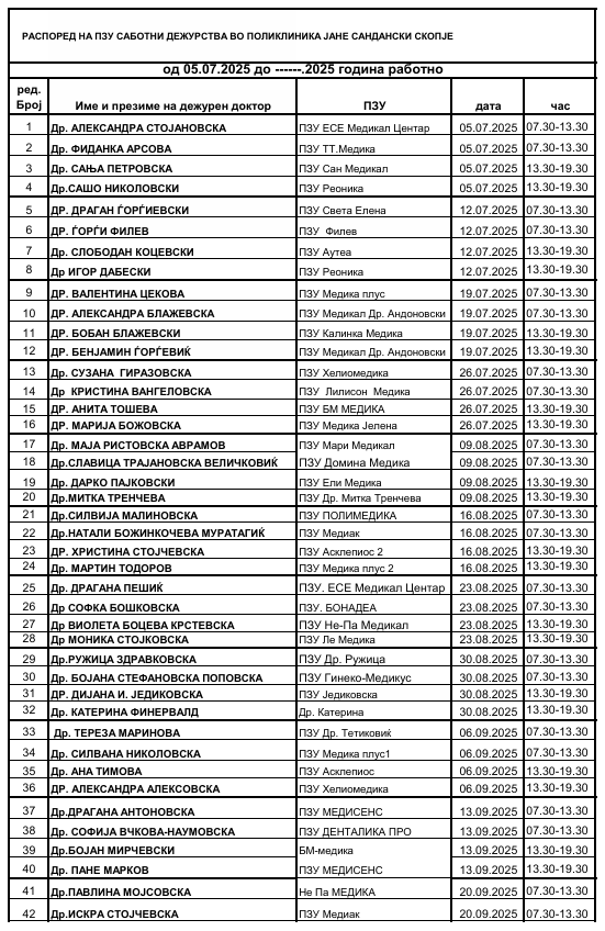 Распоред за  саботни дежурства во поликлиника Јане Сандански – Скопје  од 05-07 до 08-11 2025