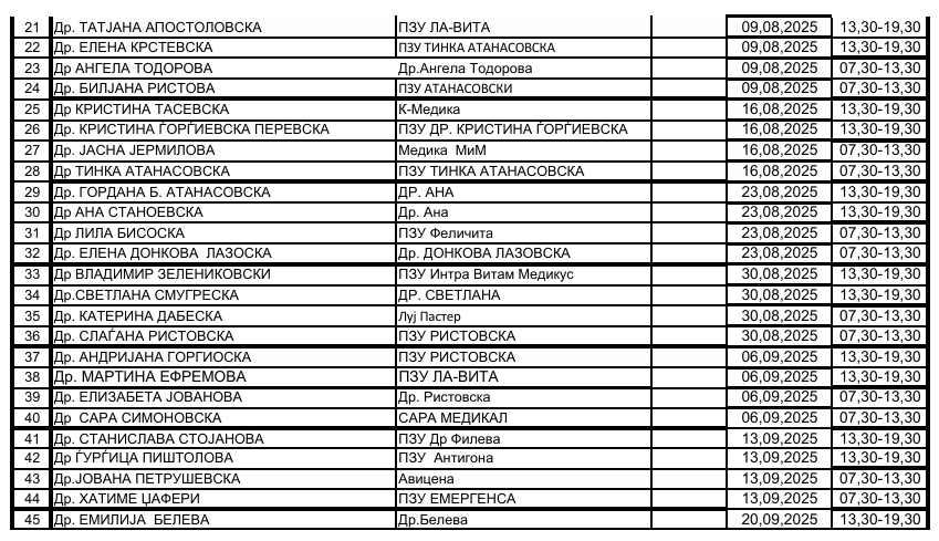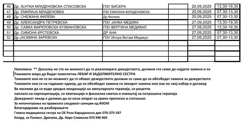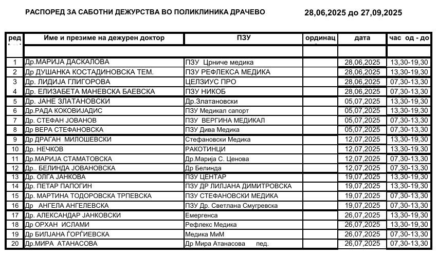 Распоред за  саботни дежурства во поликлиника Драчево – Скопје  од 28-06 до 27-09 2025