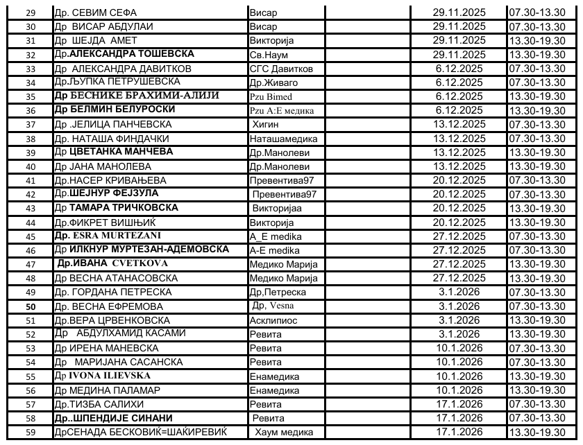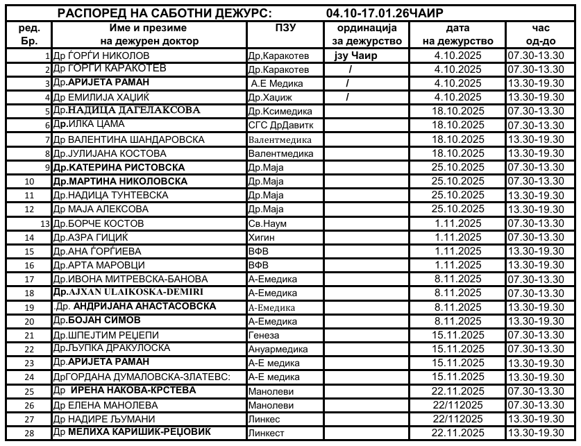 РАСПОРЕД НА САБОТНИ ДЕЖУРСТВА – ЧАИР 04.10-17.01.26.2025