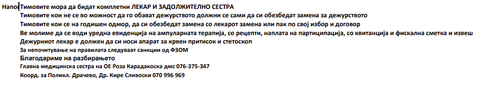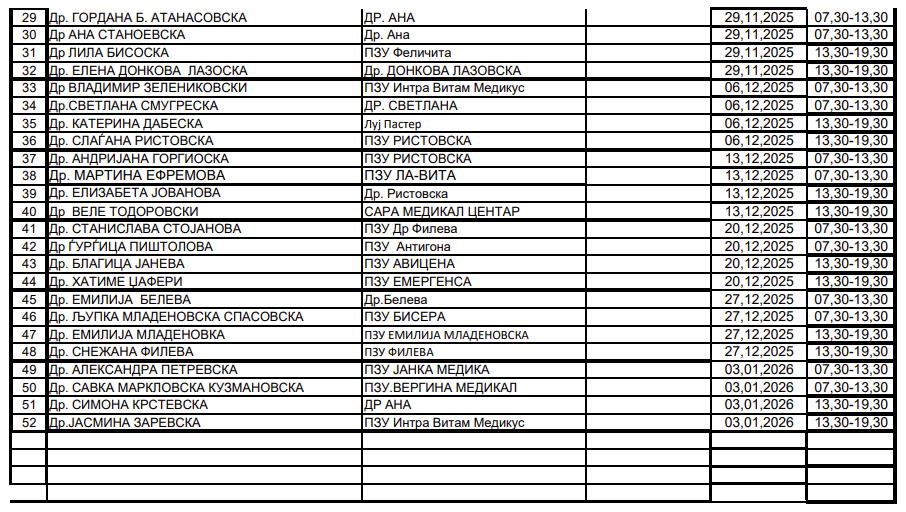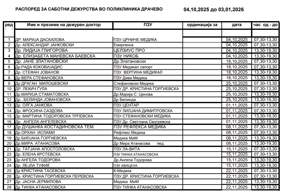 РАСПОРЕД ЗА САБОТНИ ДЕЖУРСТВА ВО ПОЛИКЛИНИКА ДРАЧЕВО 40.10.2025 – 03.01.2026