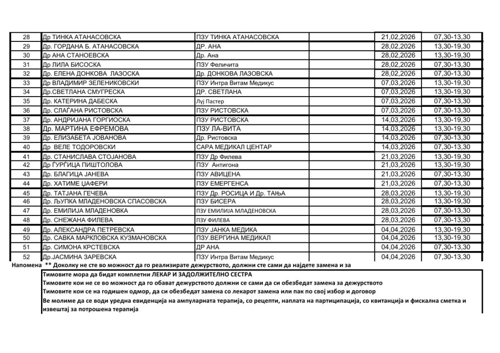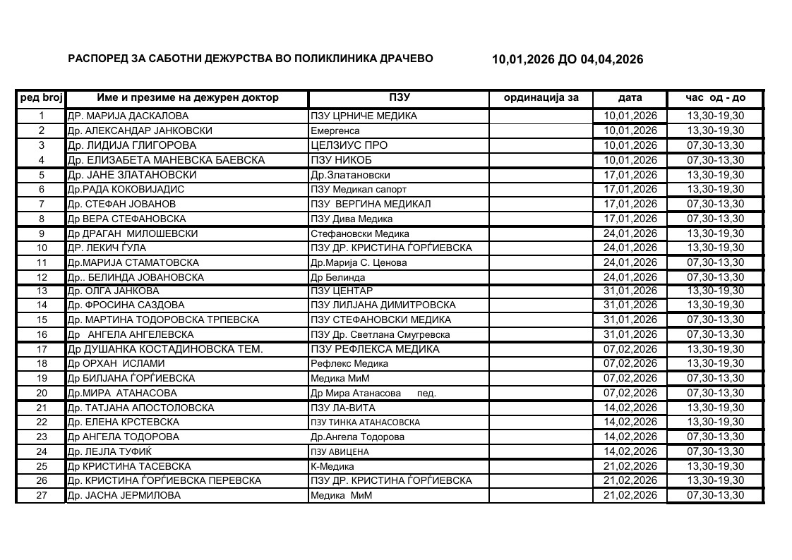 РАСПОРЕД ЗА САБОТНИ ДЕЖУРСТВА ВО ПОЛИКЛИНИКА ДРАЧЕВО 10,01,2026 ДО 04,04,2026