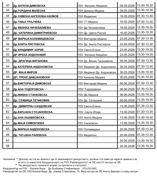РАСПОРЕД НА ПЗУ САБОТНИ ДЕЖУРСТВА ВО ПОЛИКЛИНИКА ЈАНЕ САНДАНСКИ СКОПЈЕ