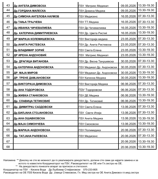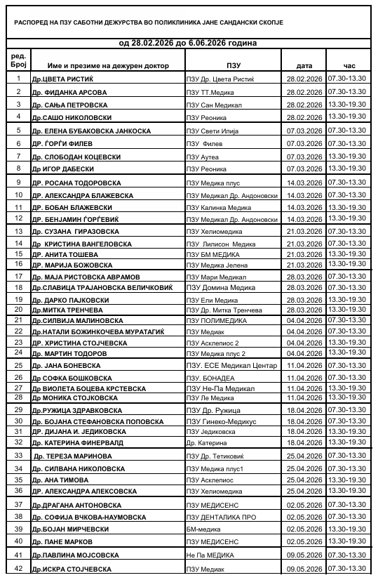 РАСПОРЕД НА ПЗУ САБОТНИ ДЕЖУРСТВА ВО ПОЛИКЛИНИКА ЈАНЕ САНДАНСКИ СКОПЈЕ