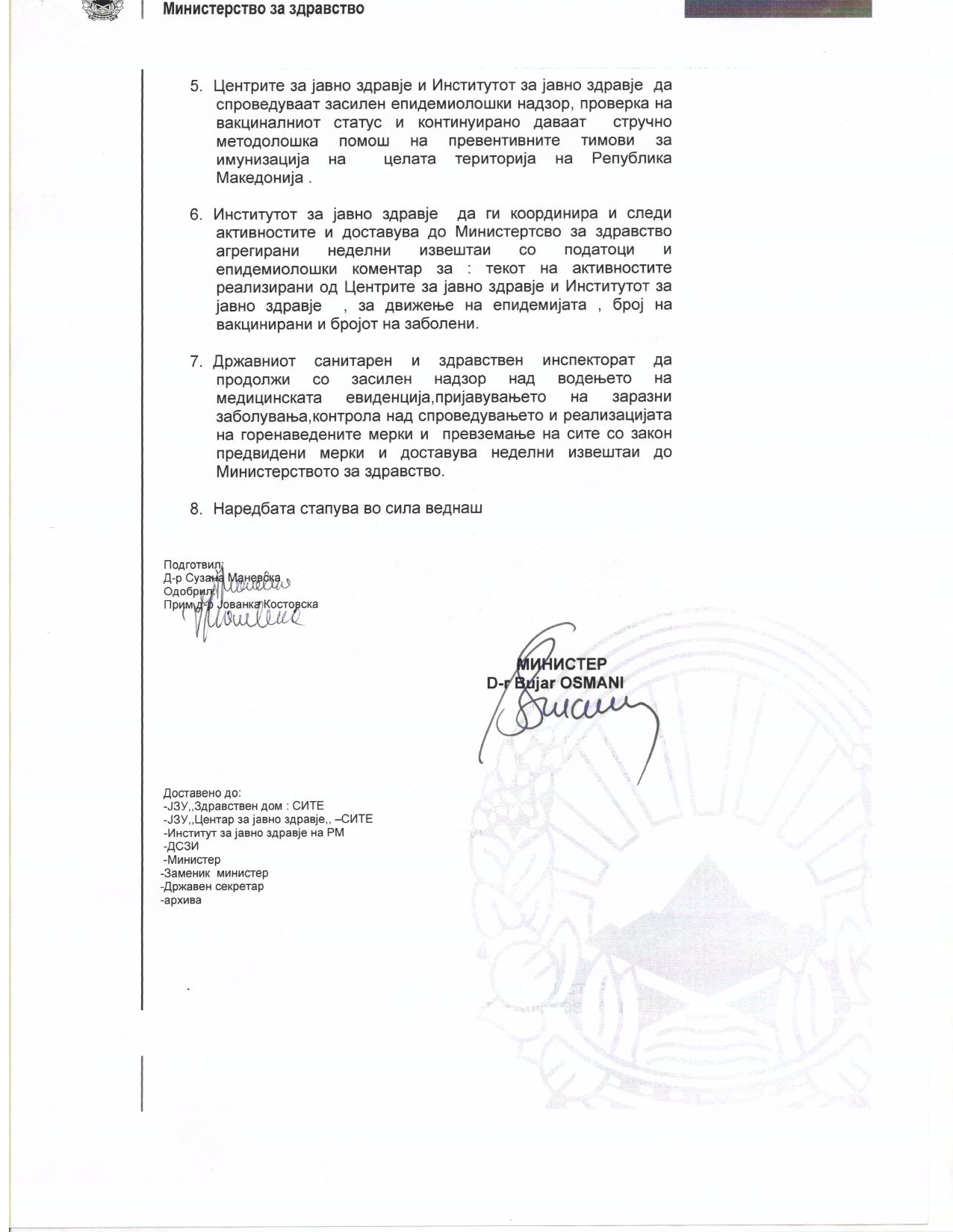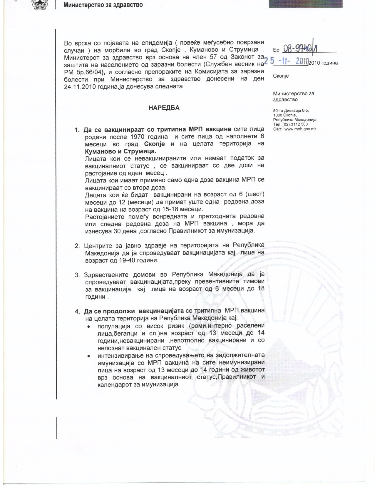 Наредбата од Министерот за Здравство по однос на превентивните мерки кои што треба да се превземат по однос на епидемијата на морбили во Скопје, Струмица и Куманово можете да ја превземете во делот Превземања или на следните два линка: