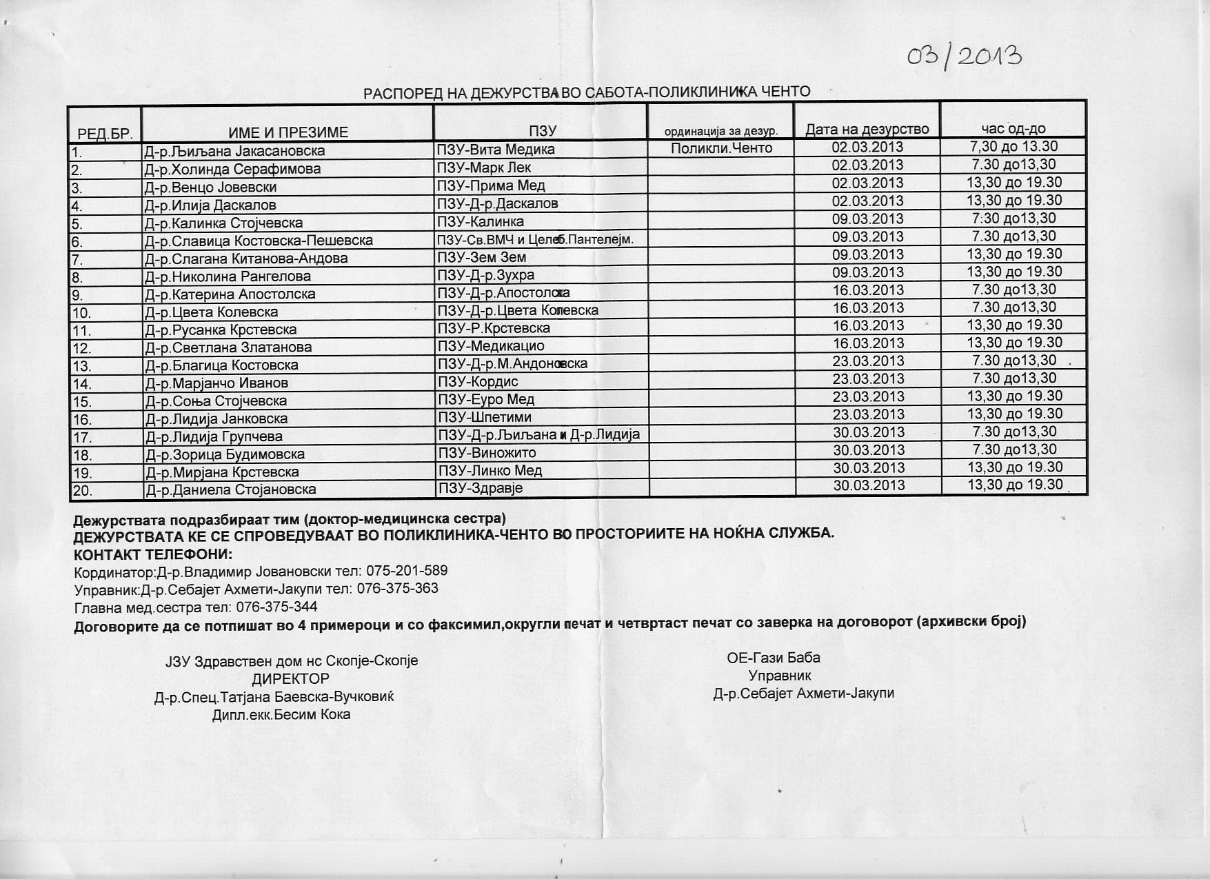 На следниот линк можете да го превземете распоредот за саботни дежурства во Поликлиника Ченто за месец март 2013.
