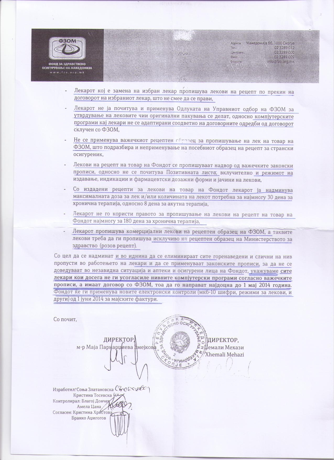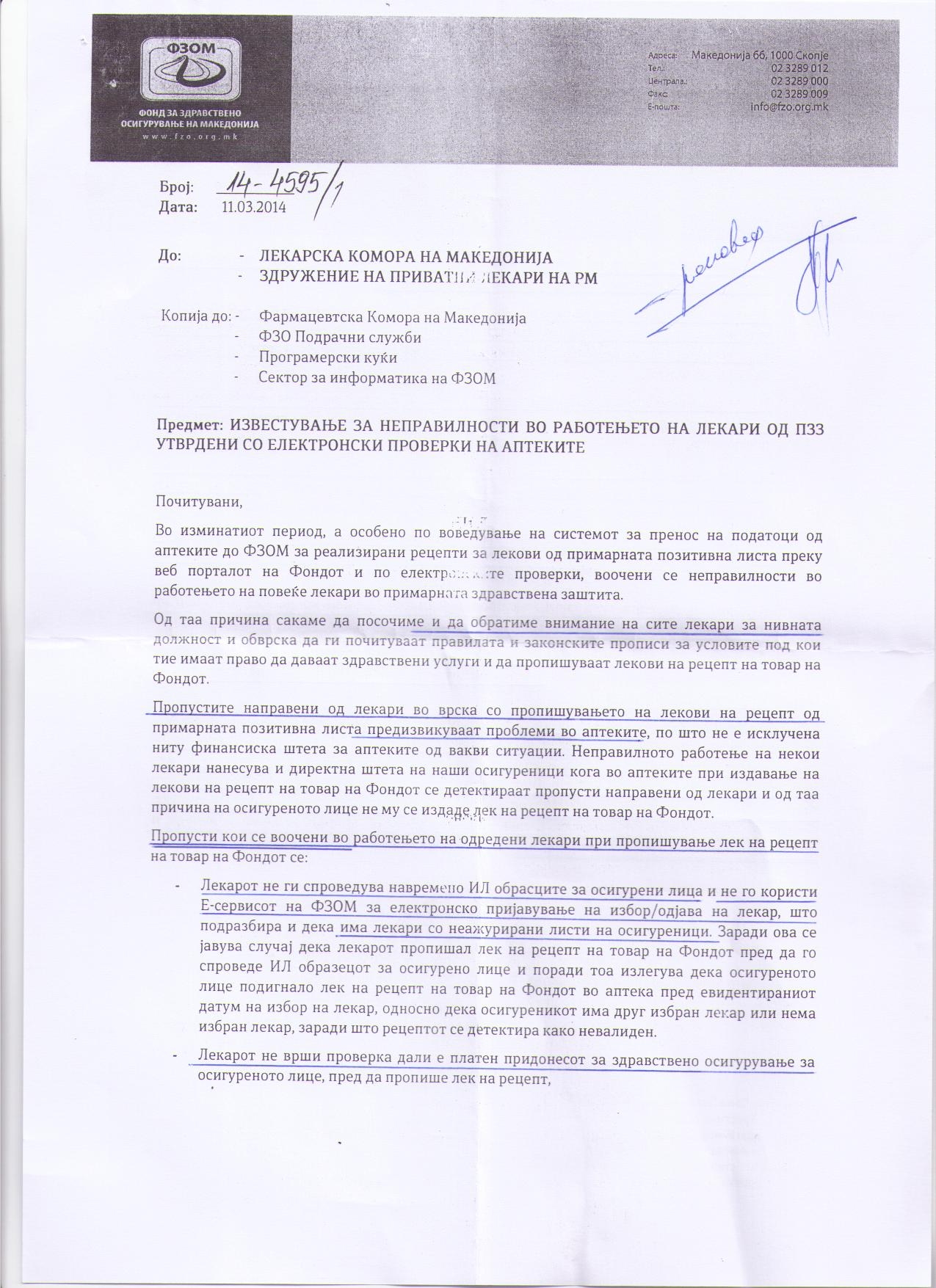 Известување за неправилности во работењето на лекари од ПЗЗ утврдени со електронски проверки на аптеките