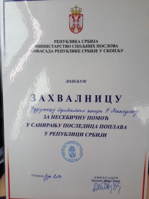 Врачување на благодарница за донација од Амбасадорот на Република Србија на Претседателот на ЗПЛРМ