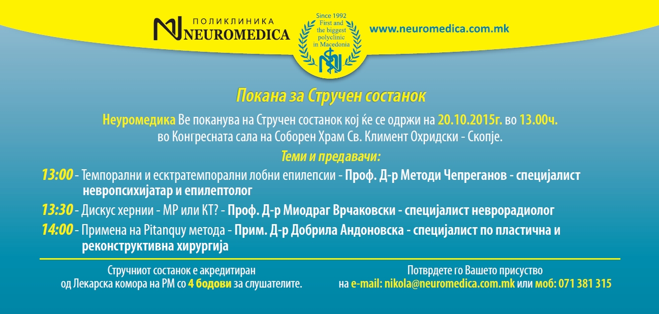 На следниот линк е поканата за Есенскиот Стручен состанок 2015 во организација на Неуромедика. Ве информираме дека стручниот состанок е акредитиран од Лекарска комора на РМ со 4 бода за слушателите.