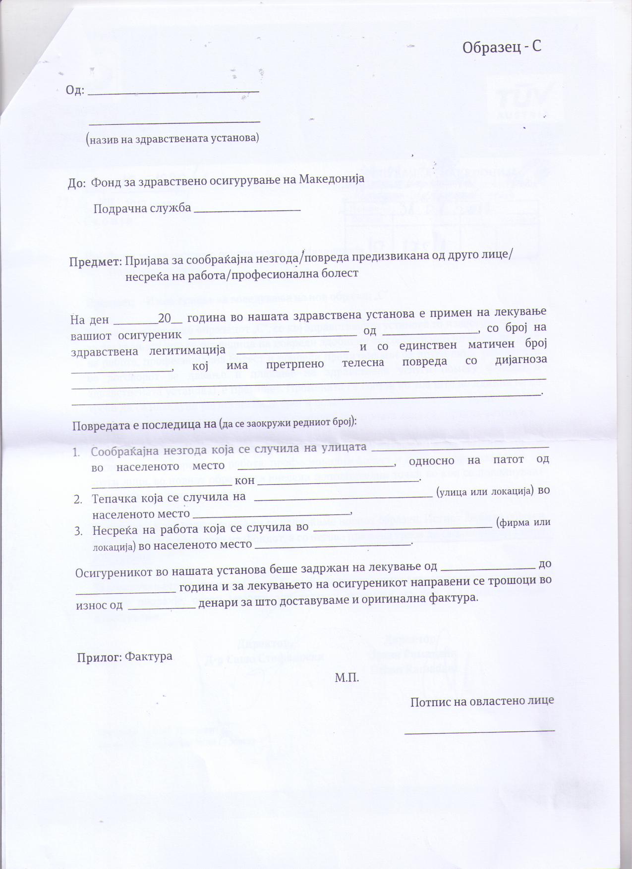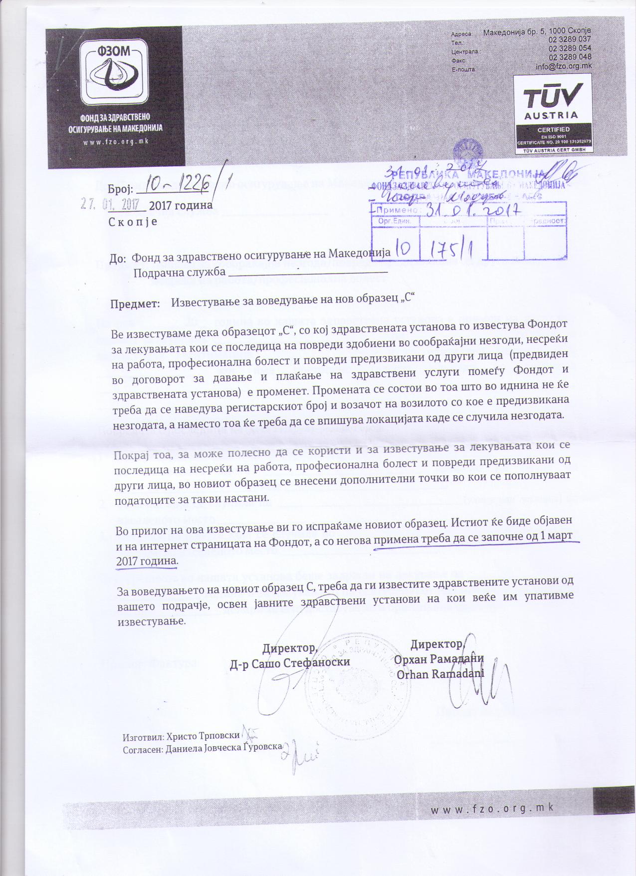 Известување за воведување на нов образец С